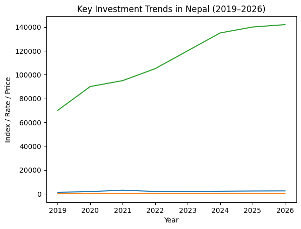 Nepal’s investments have seen cycles of highs and lows. During the 2020–2021 pandemic, the Nepal Stock Exchange (NEPSE) index surged to record highs above 3,000 points, driven by low interest rates. However, policies like the 2/12 crore loan limit and rising interest rates triggered a crash, dropping the index below 1,900 by late 2022.
