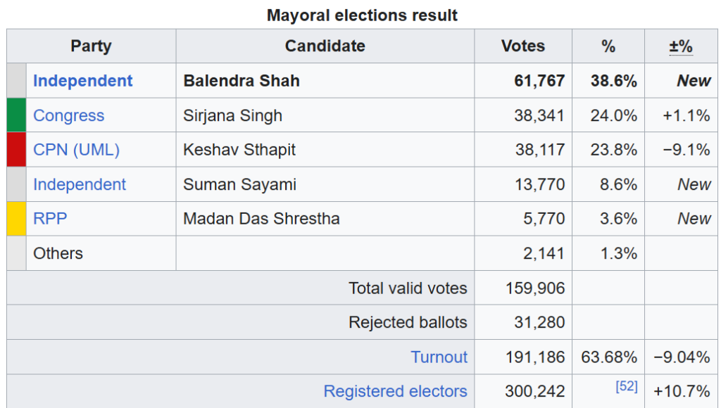 Last Election Area: Mayor of Kathmandu Metropolitan City (2022 local elections, held on May 13, 2022).