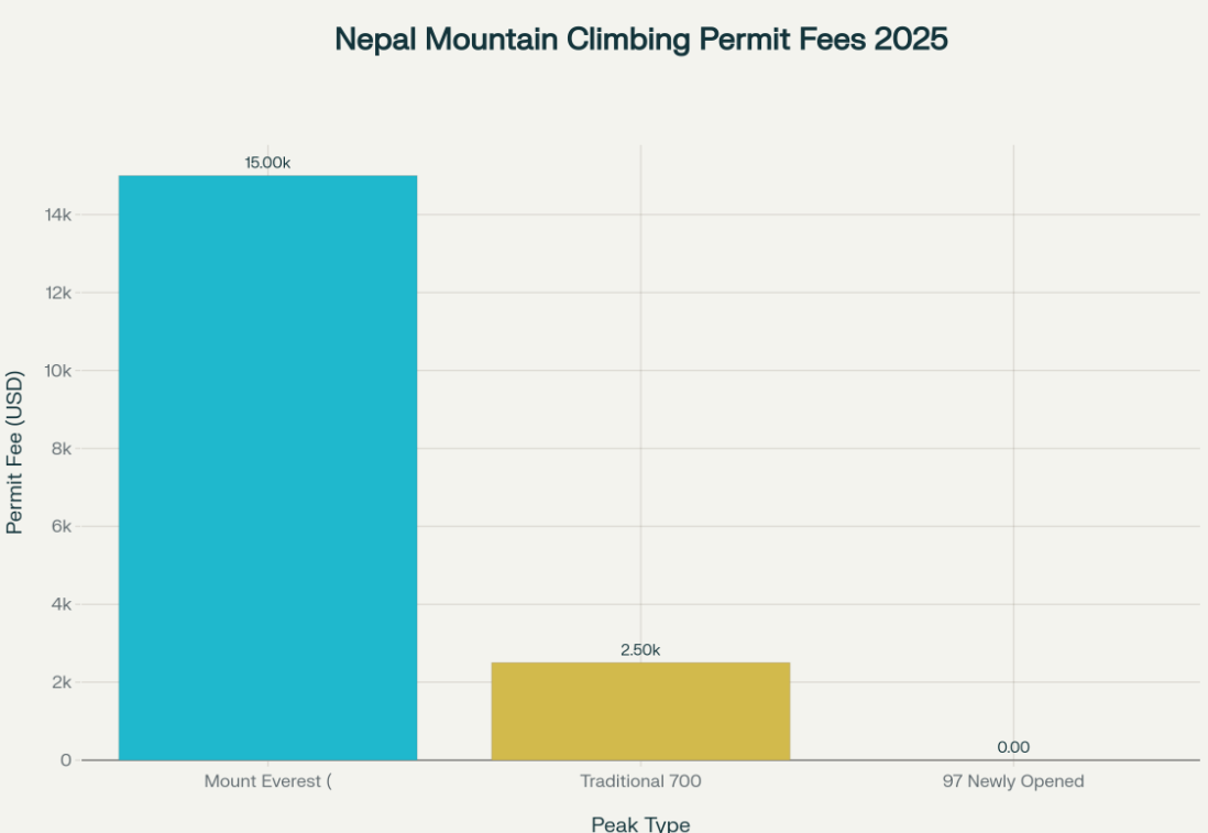 Comparison of mountain climbing permit fees in Nepal showing the stark difference between premium Everest permits and the newly waived fees for 97 remote peaks
