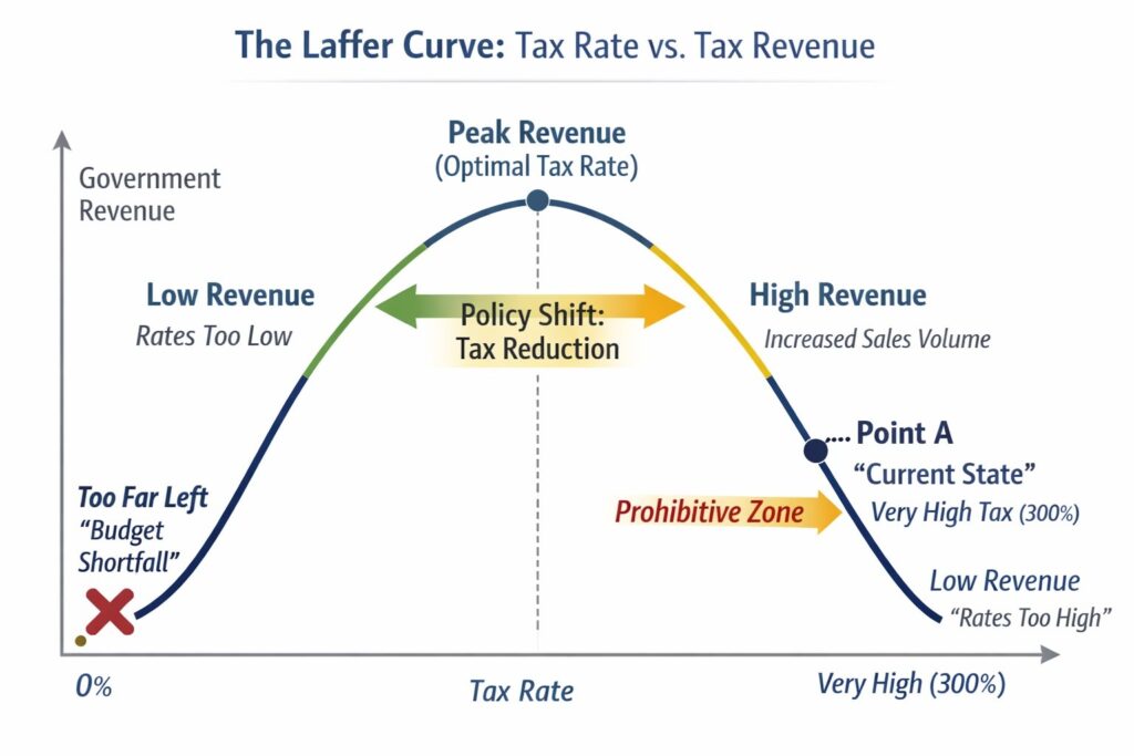 One of the primary purposes of taxation is to generate government revenue. Reducing taxes raises an important question of whether revenue will increase or decrease. This can be understood through the Laffer Curve. The Laffer Curve suggests that there is an optimal tax rate that maximizes revenue. At very high tax rates, consumers are discouraged from purchasing goods, which can reduce overall tax revenue.